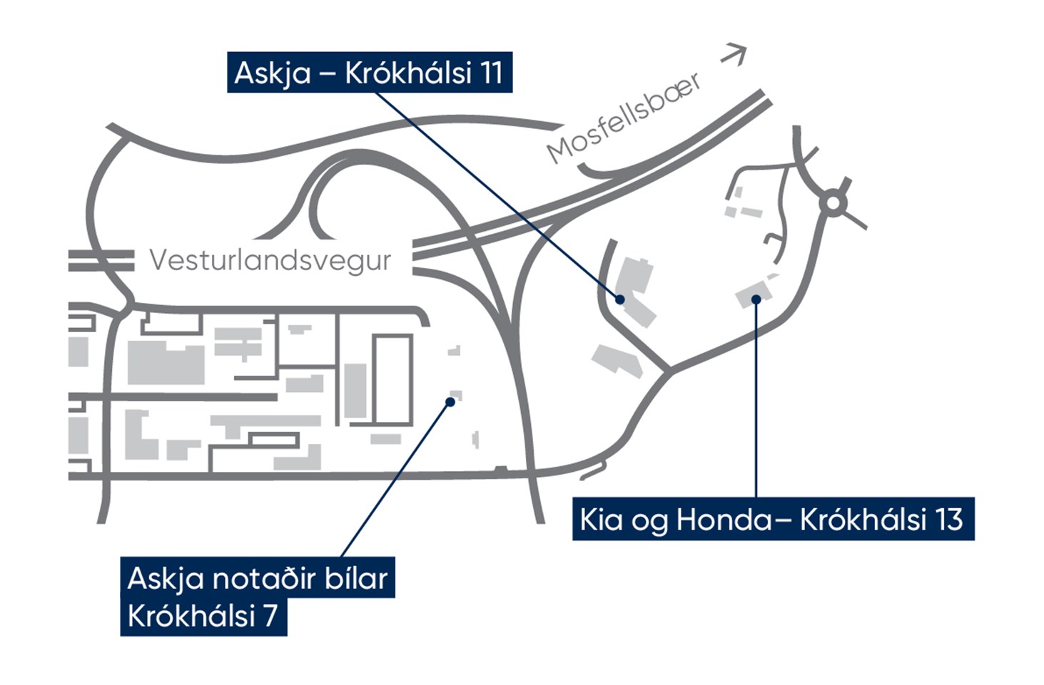 Askja notaðir bílar eru staðsettir á Krókhálsi 7. Askja notaðir bílar tekur að sér að selja allar gerðir bíla, hvort sem það er fyrir þriðja aðila eða sýna eigin.